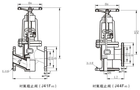 J44F46 角式襯氟截止閥適用在-50~150℃的各種濃度的王水、流酸、鹽酸、氫氟酸和各種有機酸、強酸、強氧化劑,還適用于各種濃度的強堿有機溶劑以及其它腐蝕性氣體,液體介質(zhì)的管路上使用.J44F46襯氟角式截止閥是指關(guān)閉(閥瓣)由閥桿帶動并沿閥座中心軸線做升降運動的閥門,在管路上主要用來接通或截斷管路中的介質(zhì),但不能做節(jié)流用。