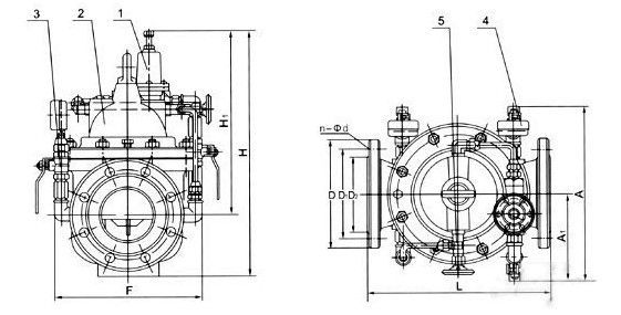 當閥門從進口端給水時,水流過針閥進入主閥控制室,出口壓力通過導管作用到導閥上。當出口壓力高于導閥彈簧設定值時,導閥關閉??刂剖彝V古潘藭r主閥控制室內壓力升高并關閉主閥,出口壓力不再升高。